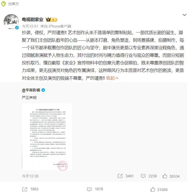随后,“华策影视严正声明”话题登上热搜,擅自截取《家业》的宣传物料中的创意元素,不仅未尊重原创团队的智力成果,还无视演员对角色的专属演绎,对于这种行为,必须严厉打击。